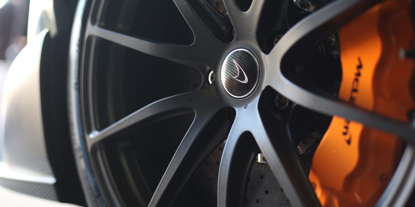 Close-up of a black McLaren alloy wheel with an orange brake caliper behind it.