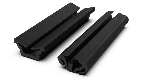 Two black rubber weatherstrips with V-shaped and grooved profiles, positioned side by side on a white background.