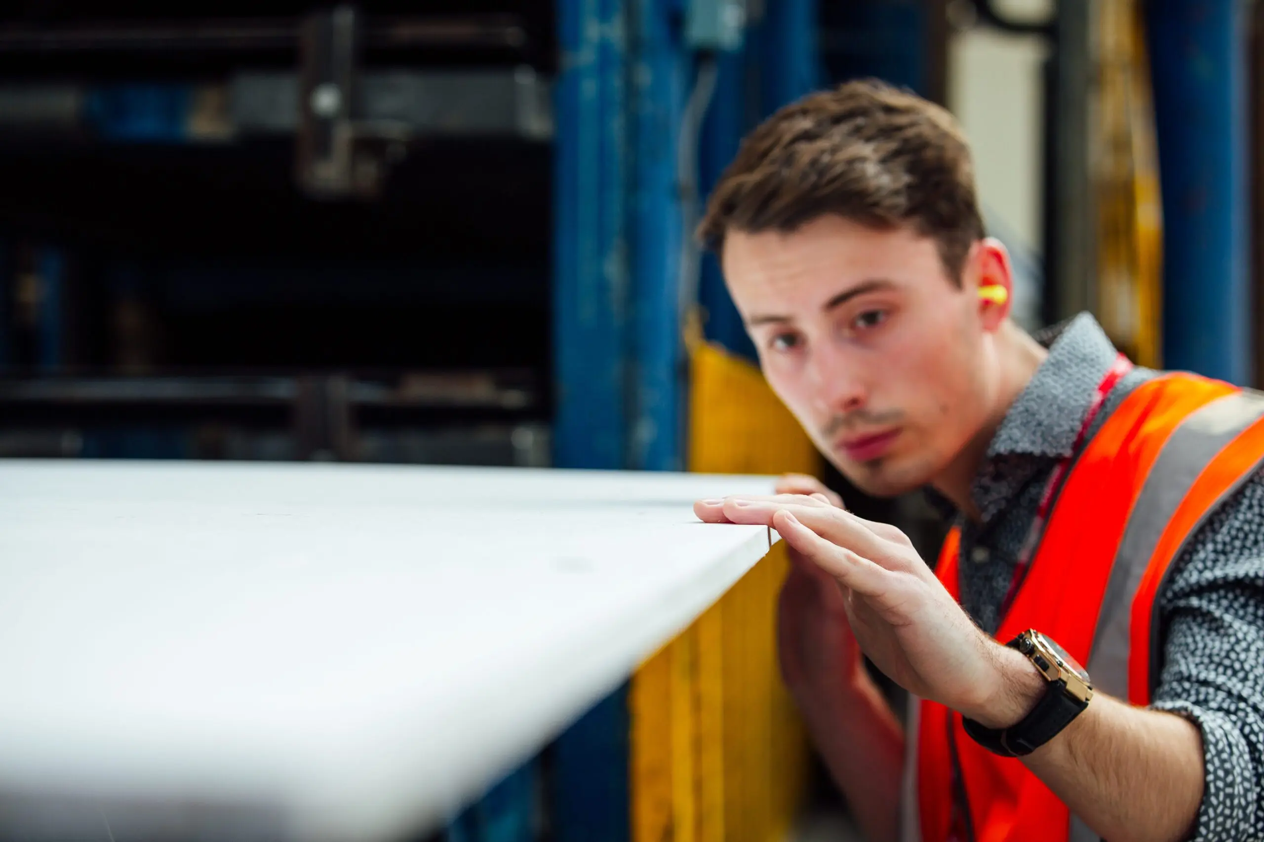 Man in safety vest and earplugs inspecting the edge of a large white panel in an industrial setting.