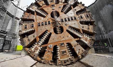 Close-up view of a large tunnel boring machine with metal cutting blades, positioned at a construction site.