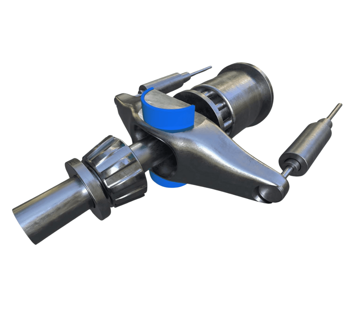 A metallic mechanical component with two blue highlights and various cylindrical parts on a white background.