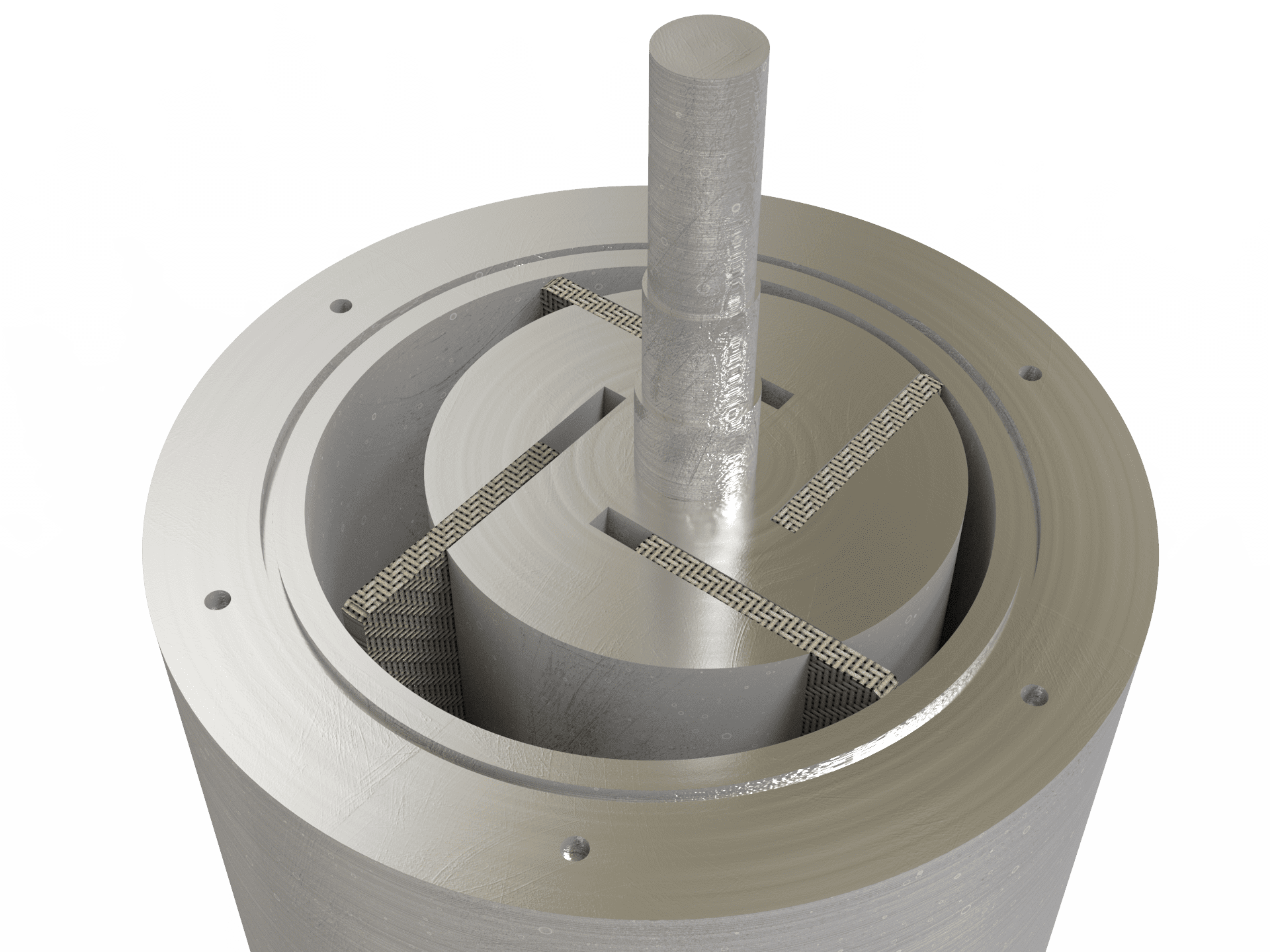 Silver cylindrical mechanical part with shaft and internal slots, viewed from above on a white background.