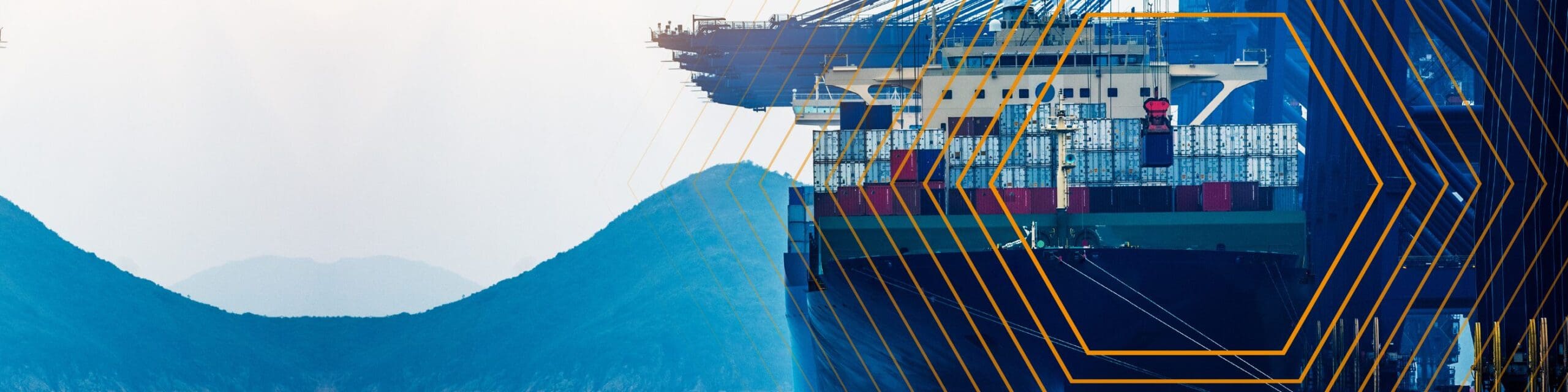 A large cargo ship docked at a port with mountains in the background and geometric lines overlay.