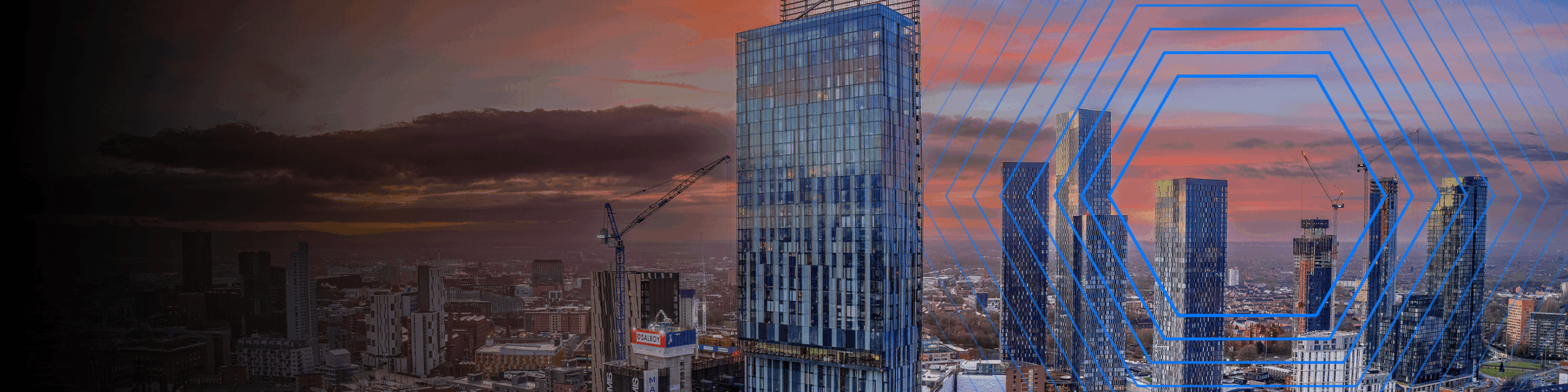Tall glass skyscrapers with cranes stand against a dramatic sunset sky over a cityscape. Blue geometric lines overlay.