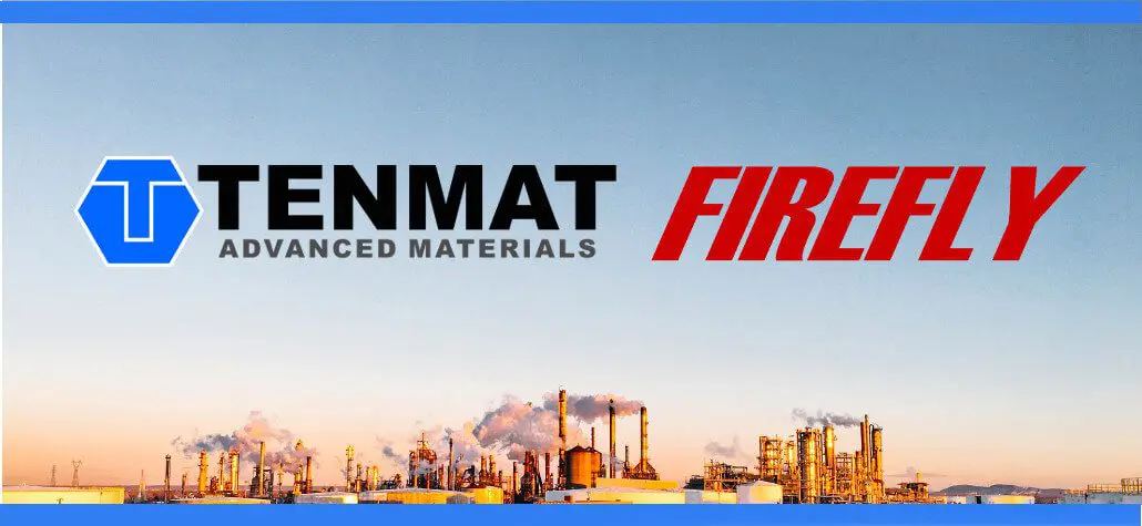 Tenmat Advanced Materials and Firefly logos above an industrial plant with smoke stacks at sunset.