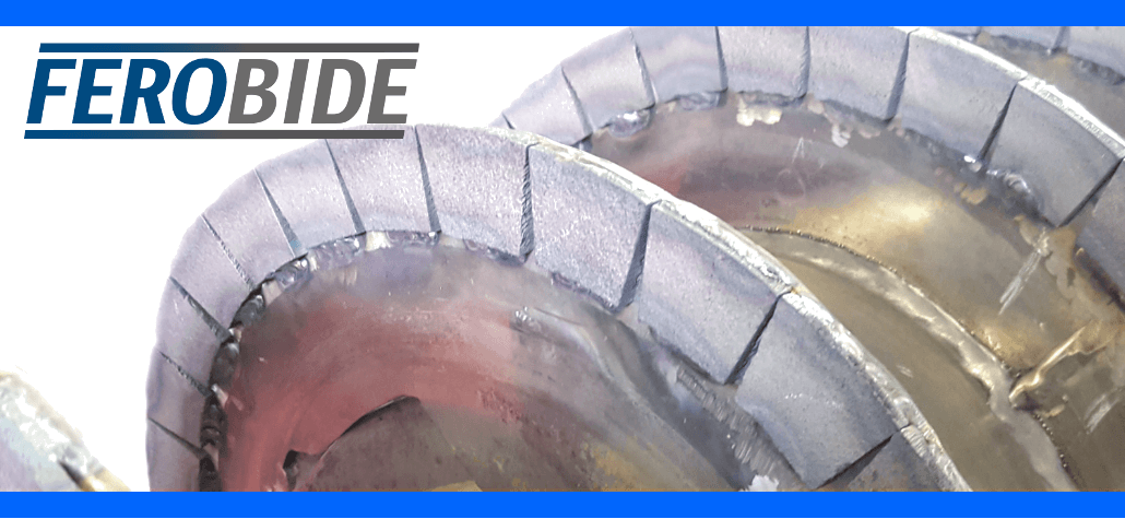 Close-up of metal screw conveyor blades with protective Ferobide tiles; Ferobide logo at top left.