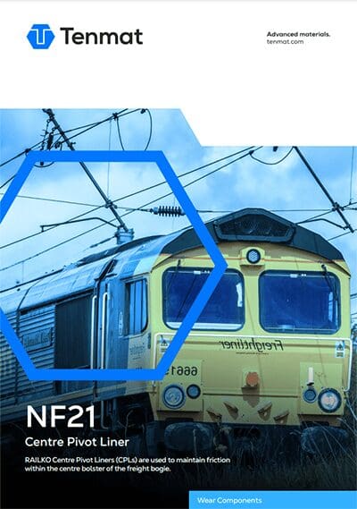 A yellow freight train under overhead wires, with blue hexagon graphics and Tenmat NF21L Centre Pivot Liner text.
