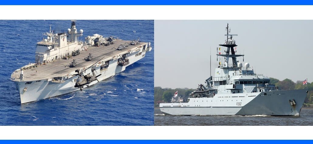 Two naval ships: one aircraft carrier with helicopters, and one patrol vessel sailing on the water.